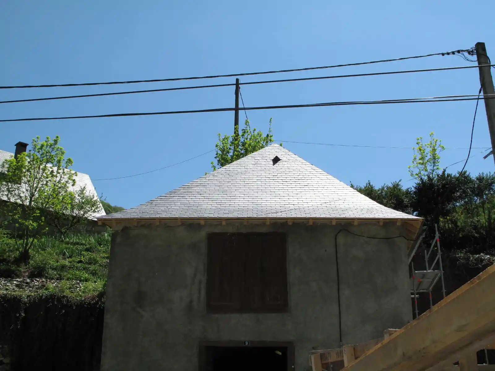 Après avoir renforcé la charpente (arbalétrier rongé par l’humidité, chevrons abimés), les charpentiers-couvreurs ont posé la nouvelle couverture :